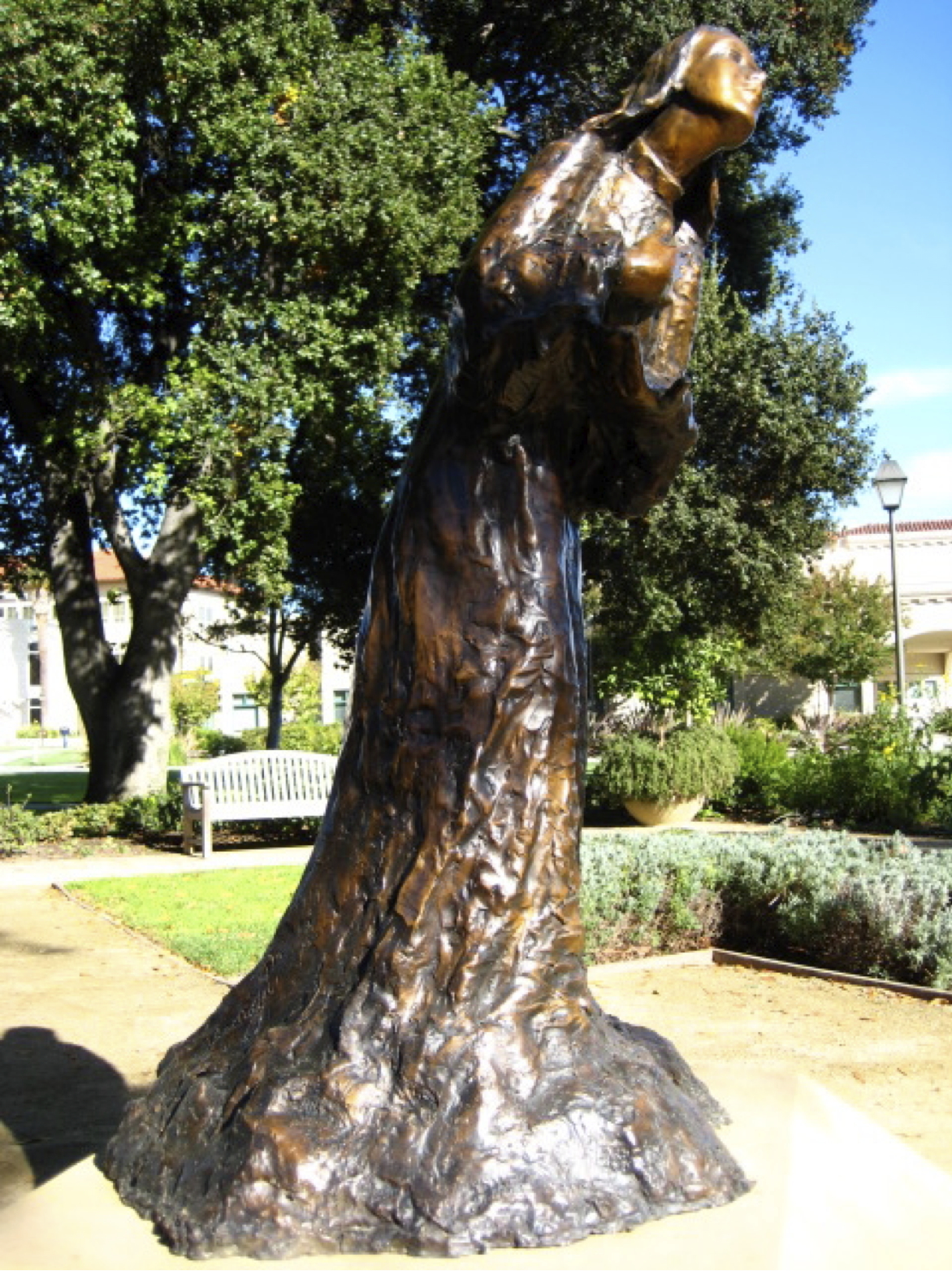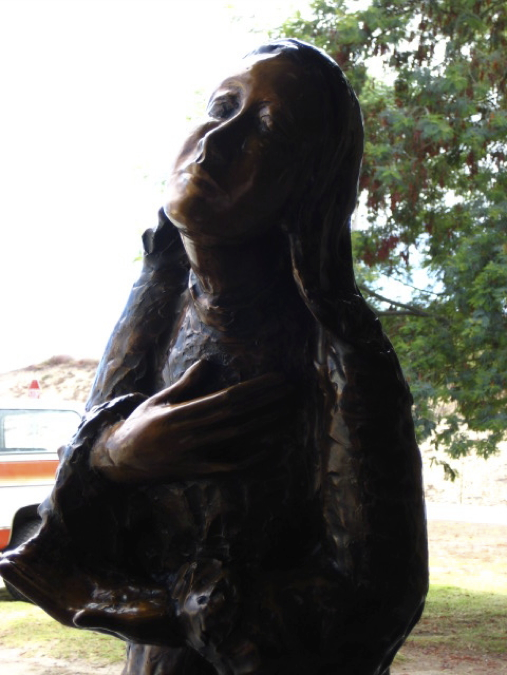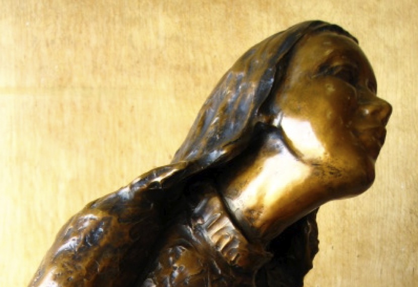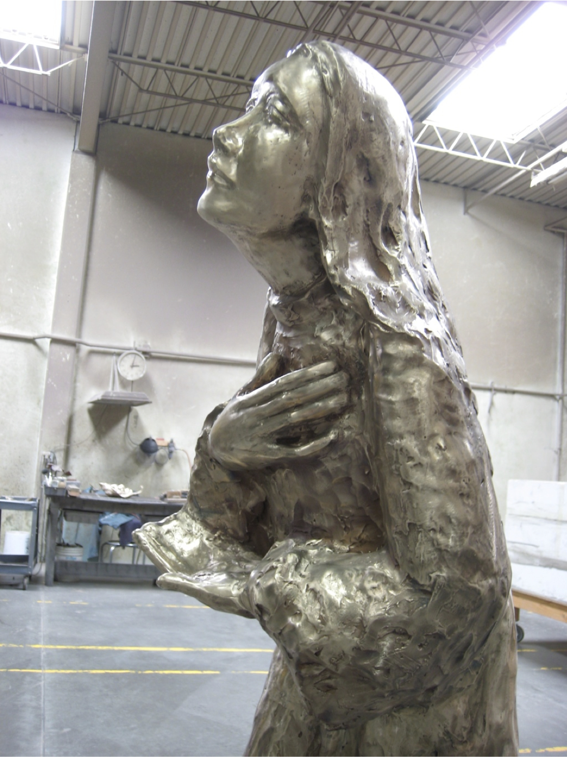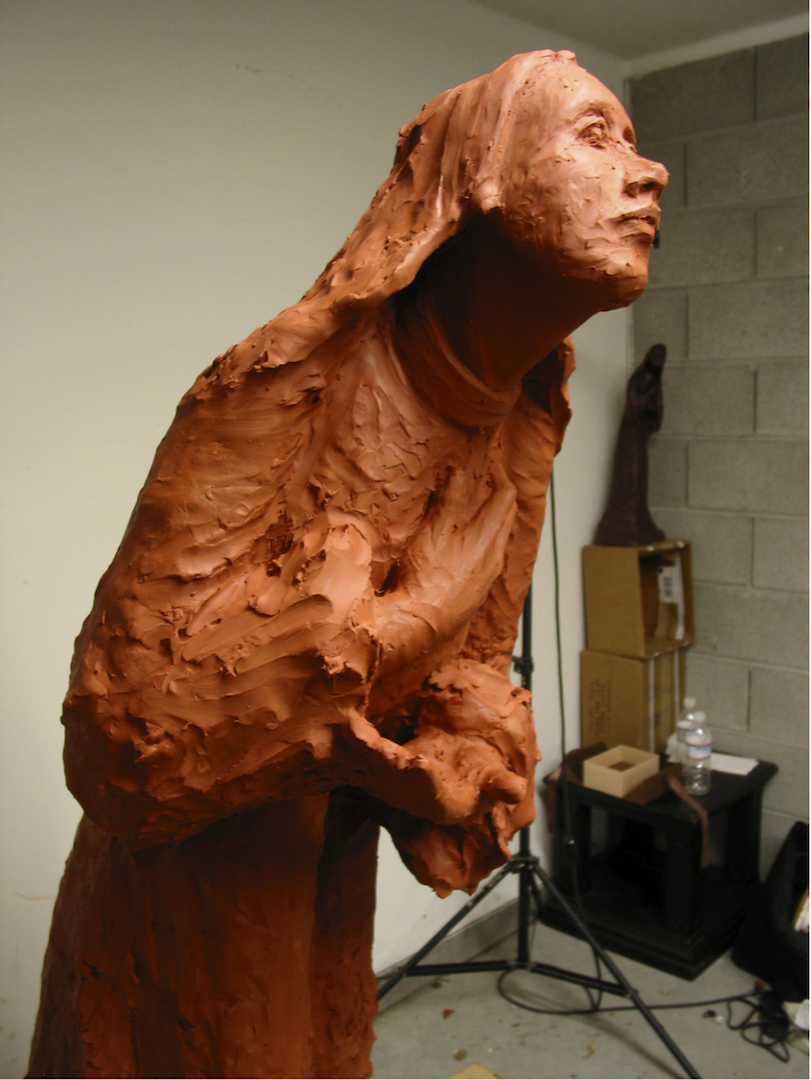 I portray the Poor Clare in a moment of prayer as she listens to the divine’s will. This is at the moment that she decides to renounce worldly desires to follow God and the example of Saint Francis of Assisi. The sculpture depicts Saint Clare stands yearning toward God. One hand opens to receive the divine’s grace, and the other touches her heart as a sign of humility. After all, her gesture carries the movement of spiritual desire as she prepares to devote her entire life to the sacred call.